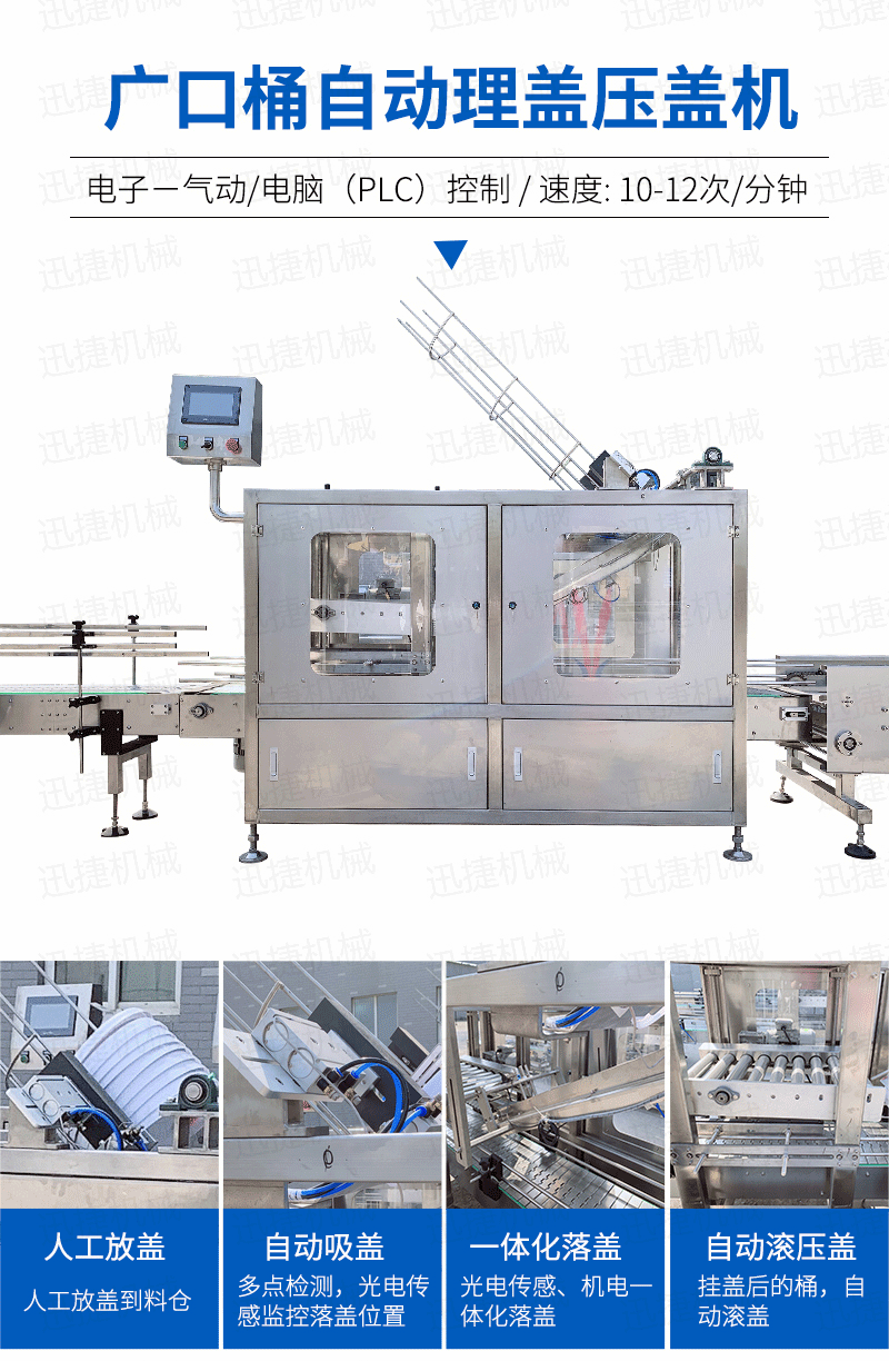 自動理蓋壓蓋機可以完成自動完成理蓋、壓蓋、輸送進瓶、輸送出瓶等一系列操作,設(shè)備采用機械式原理,電機驅(qū)動,具有工作穩(wěn)定可靠,操作簡便,生產(chǎn)效率高,適用范圍廣等特點。廣泛應(yīng)用于各種規(guī)則的玻璃、塑料材質(zhì)的圓瓶、方瓶的壓蓋,是日化、化妝品、醫(yī)藥、食品等行業(yè)的理想壓蓋設(shè)備。