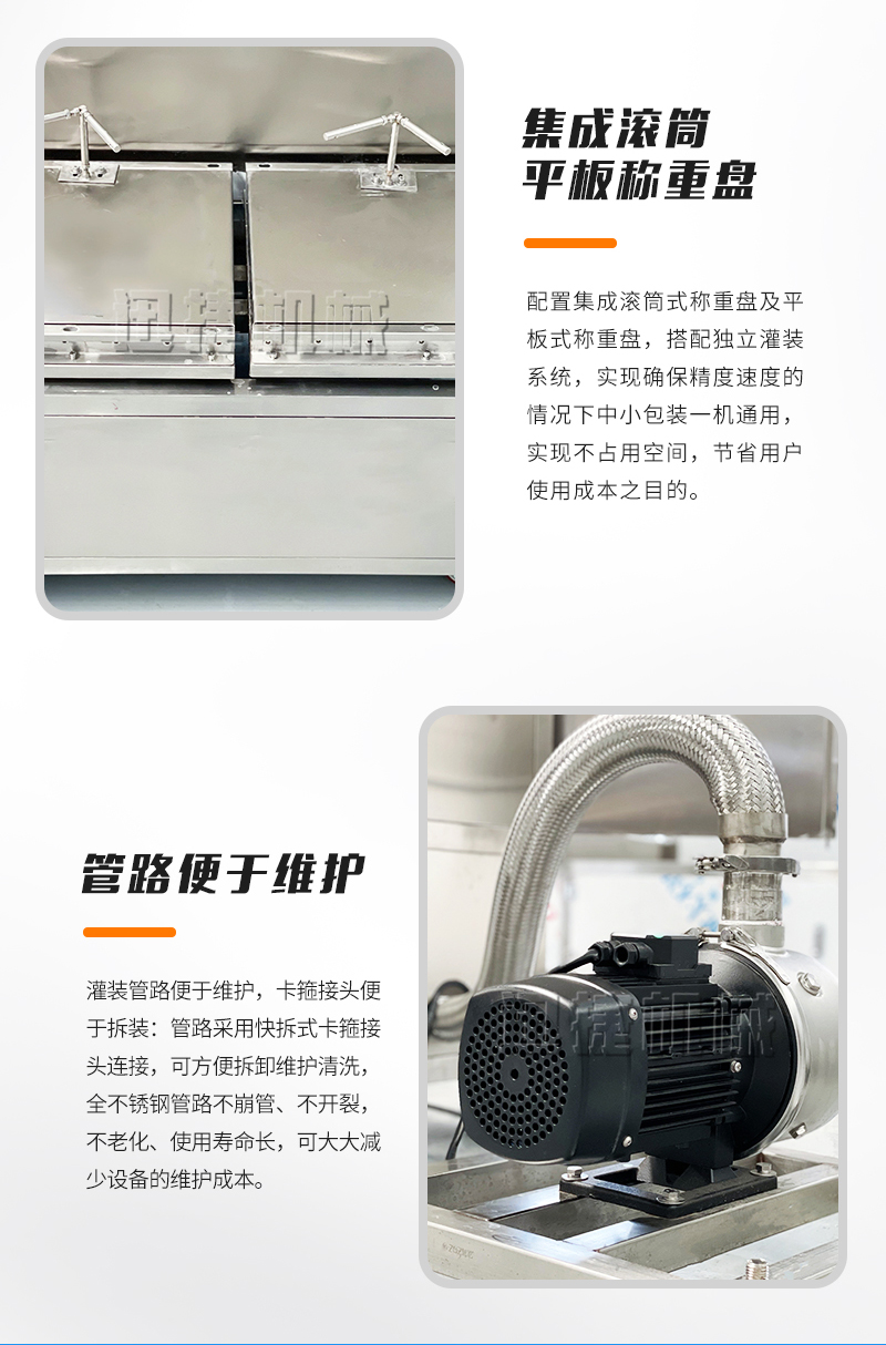 5.集成滾筒、平板稱重盤,一機(jī)多用,方便快捷:配置集成滾筒式稱重盤及平板式稱重盤,搭配獨(dú)立灌裝系統(tǒng),實(shí)現(xiàn)確保精度速度的情況下中小包裝一機(jī)通用,實(shí)現(xiàn)不占用空間,節(jié)省用戶使用成本之目的。